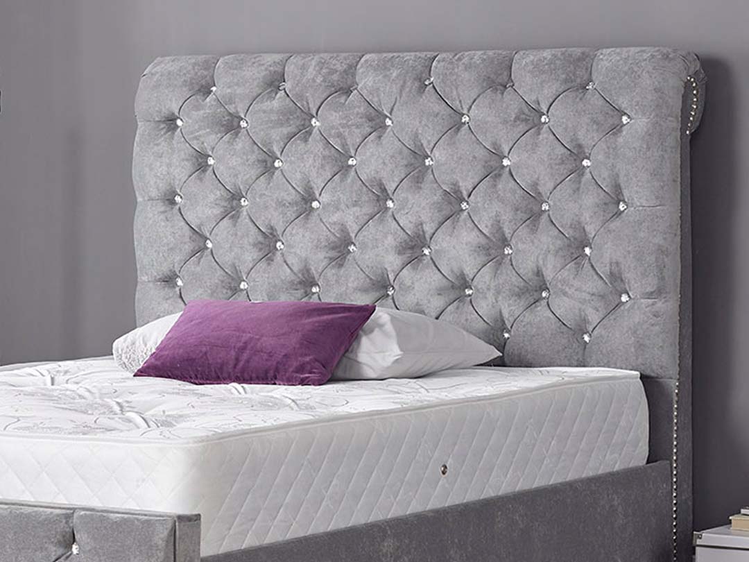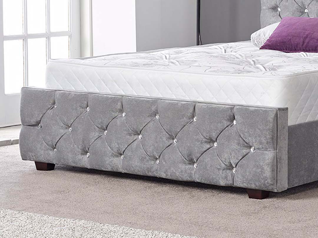 Following a classic design, the Aura bed frame adds a splash of simplistic style to any bedroom. Manufactured with the highest quality materials, the Aura frame features a strong and sturdy construction. With over 30 fabrics to choose from in the extensive selection, finding the perfect match for your decor couldnt be easier. If additional space is required, the Aura frame has the option of being upgraded to an ottoman storage base. The stunning headboard boasts a chesterfield inspired design, with a gentle scrolled top, a studded border and elegant diamante detailing. Adding the finishing touch to the Aura frame is the padded footboard, with diamond stitch design and diamante detailing. The Frame is photographed upholstered in Marble Platinum.