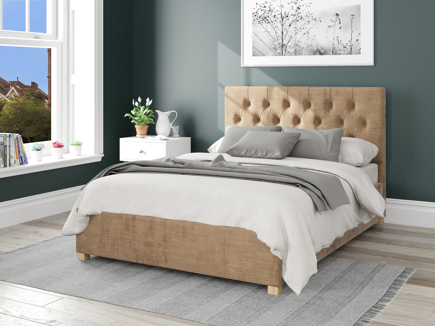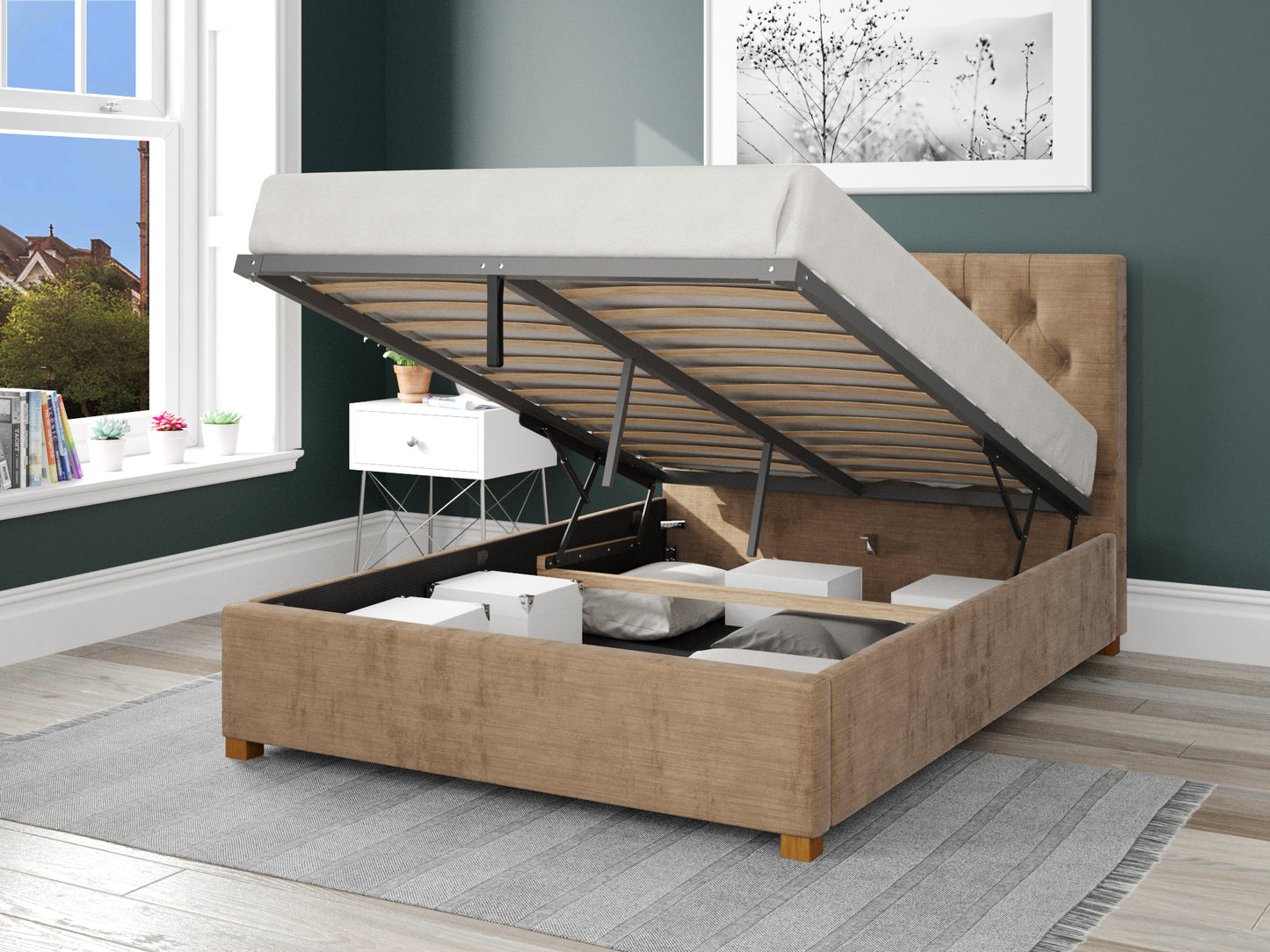 Boasting a stunning contemporary design, the Carme fabric ottoman frame oozes modern style upholstered in a sleek champagne fabric. The Carme ottoman is expertly handcrafted in the UK. Providing additional levels of comfort and support as you sleep, the Carme features a sprung slatted base that works in perfect harmony with your mattress. Ideal for clothing, bedding or any other essentials, the large ottoman storage space is perfect for keeping any bedroom clutter free. The ottoman storage compartment is lined with a durable fabric base. The Carmes eye-catching headboard showcases a sleek diamond stitch design paired with intricate button detailing to ensure it becomes a focal point of any bedroom. Adding the perfect finishing touch are the chunky wooden feet, which create a stunning two tone effect once paired with the fabric upholstery.