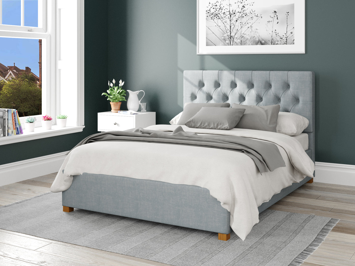 Boasting a stunning contemporary design, the Carme fabric ottoman frame oozes modern style upholstered in a sleek sky fabric. The Carme ottoman is expertly handcrafted in the UK. Providing additional levels of comfort and support as you sleep, the Carme features a sprung slatted base that works in perfect harmony with your mattress. Ideal for clothing, bedding or any other essentials, the large ottoman storage space is perfect for keeping any bedroom clutter free. The ottoman storage compartment is lined with a durable fabric base. The Carmes eye-catching headboard showcases a sleek diamond stitch design paired with intricate button detailing to ensure it becomes a focal point of any bedroom. Adding the perfect finishing touch are the chunky wooden feet, which create a stunning two tone effect once paired with the fabric upholstery.