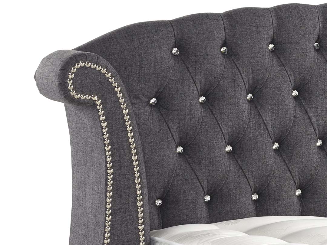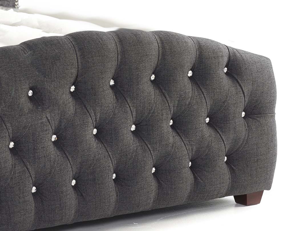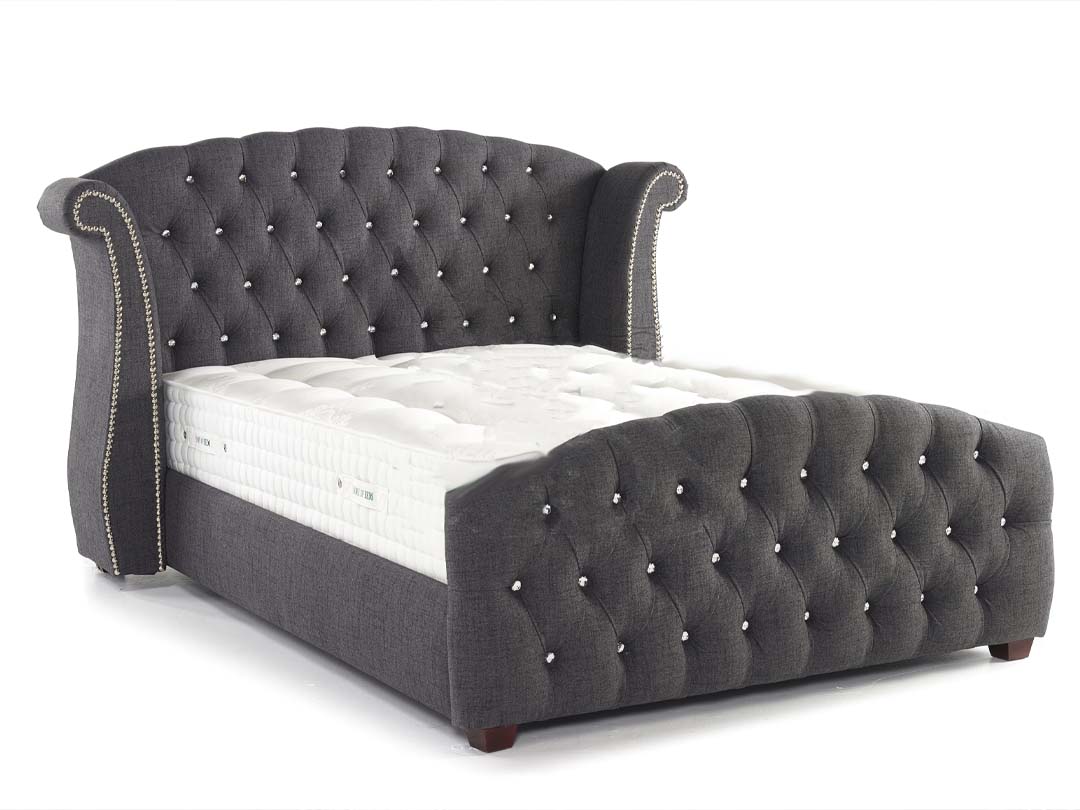 The Fortuna bed frame boasts a traditional style designed to instantly transform the look of any bedroom. Manufactured with the highest quality materials, the Fortuna frame features a strong and sturdy construction. Finding the perfect match for your bedroom decor couldnt be easier, with over 30 colours to choose from in the extensive selection of fabrics. If additional space is required, the Fortuna frame has the option of being upgraded to an ottoman storage base. Taking inspiration from the traditional chesterfield design, the stunning headboard features sumptuous padding, prominent winged sides and elegant diamante detailing. The frame is photographed upholstered in Naples Slate.