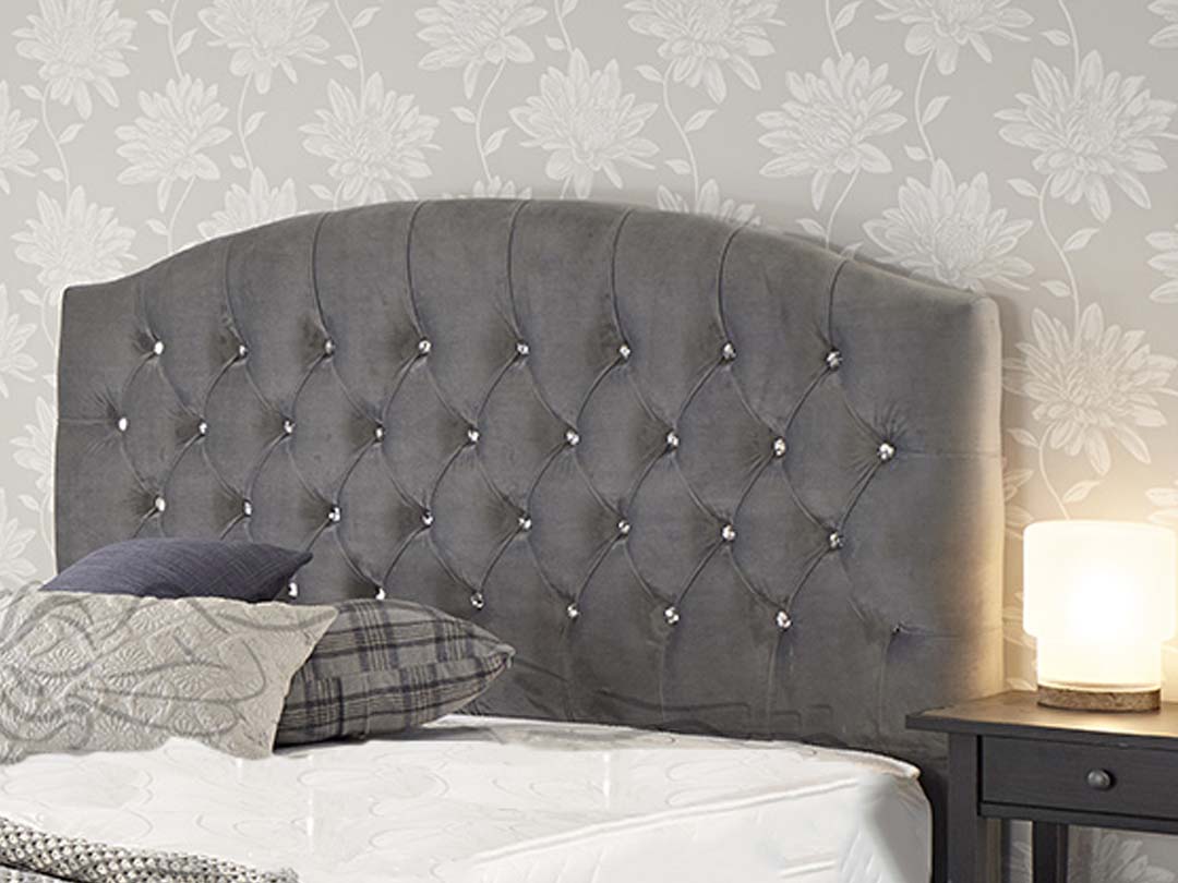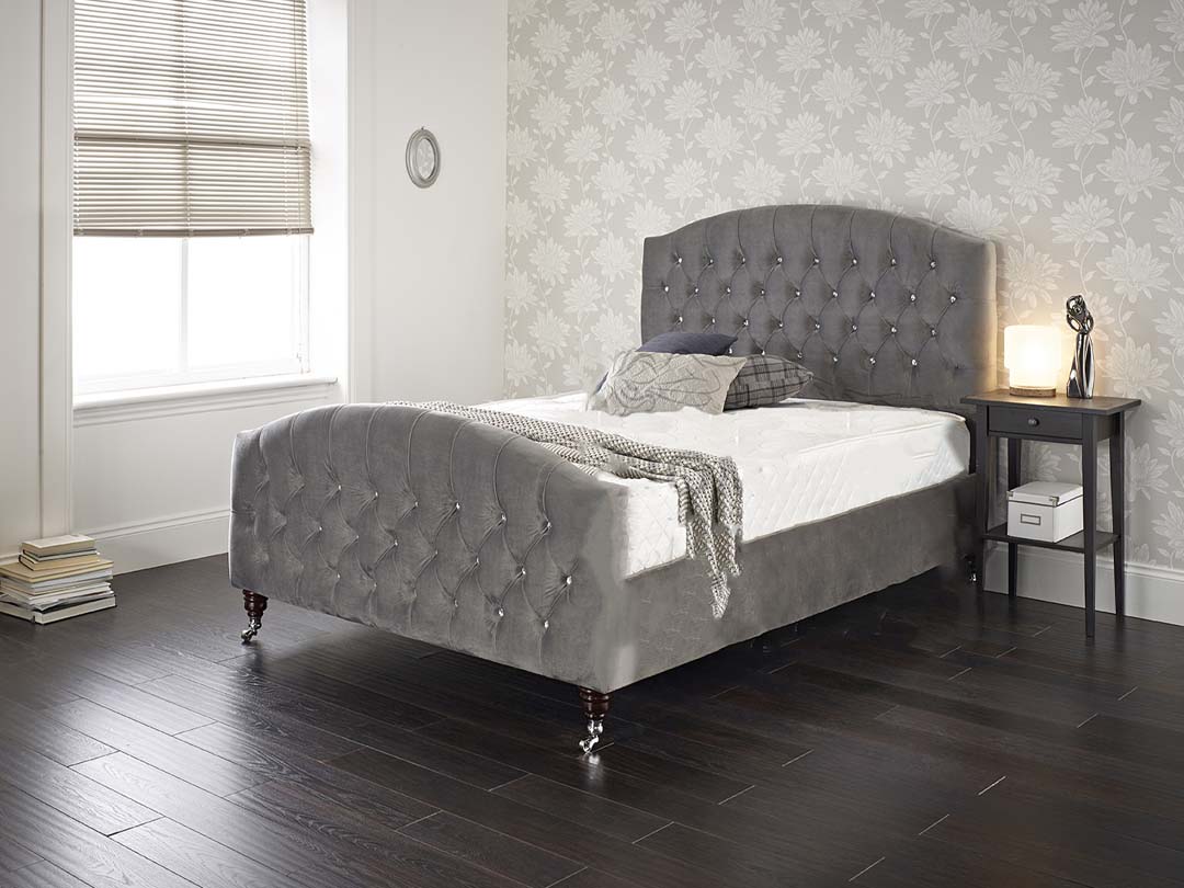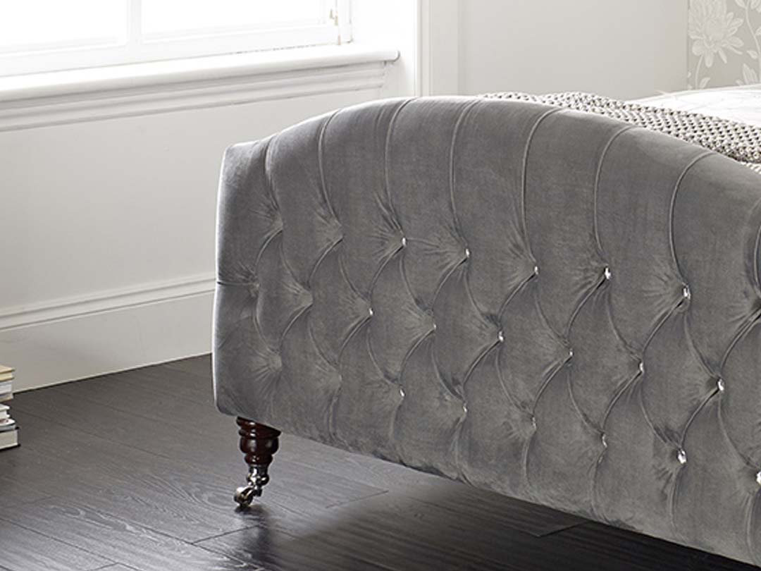The Juno bed frame Instantly transforms the look of any bedroom with its timeless elegance and style. Manufactured with the highest quality materials, the Juno frame features a strong and sturdy construction. Finding the perfect match for your decor is just a click away with over 30 options to choose from in the extensive fabric selection. If additional space is required, the Juno frame has the option of being upgraded to an ottoman storage base. Following a traditional design, the matching headboard and footboard feature an elegant diamond stitch pattern with diamante detailing. Adding the finishing touch to this stunning frame are the unique tapered metal legs. The Frame is photographed upholstered in Rhodeo Grey.