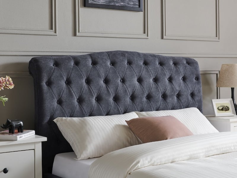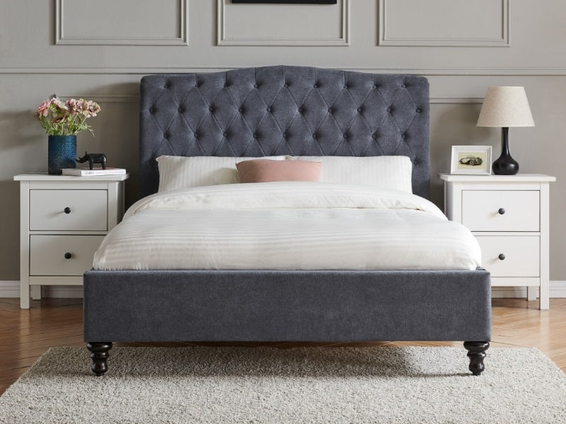 The Rosa fabric bed frame from Limelight features a traditional design paired with a choice of colours to add a touch of elegance to any bedroom. With a sleek dark grey fabric upholstery, this tone can work effortlessly with any bedroom colour schemeThe highlight of this exquisite frame is the eye-catching chesterfield style buttoned headboard with a subtle scroll design and luxurious deep padding, relaxing in bed has never been more comfortable. Completing the classic look of the Rosa frame are designer tapered dark wooden feet which paired with the fabric upholstery creates a luxury two tone feel.